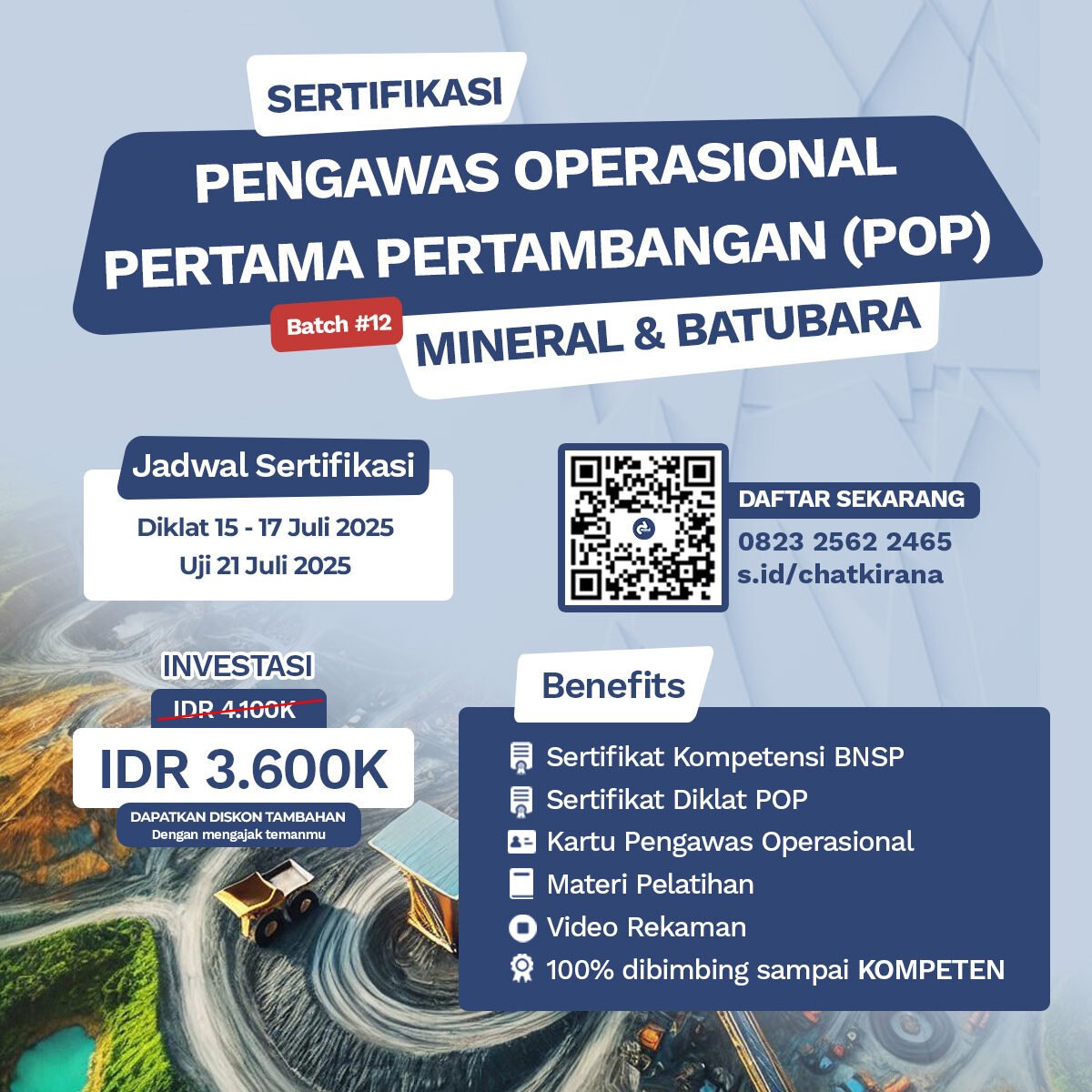 Keselamatan bekerja dalam industri tambang merupakan segala kegiatan yang meliputi pengelolaan keselamatan, kesehatan kerja, dan keselamatan operasional pertambangan. Keselamatan operasional merupakan salah satu tanggung jawab dari Pengawas Operasional Pertambangan. Sertifikasi POP BNSP resmi terpercaya.